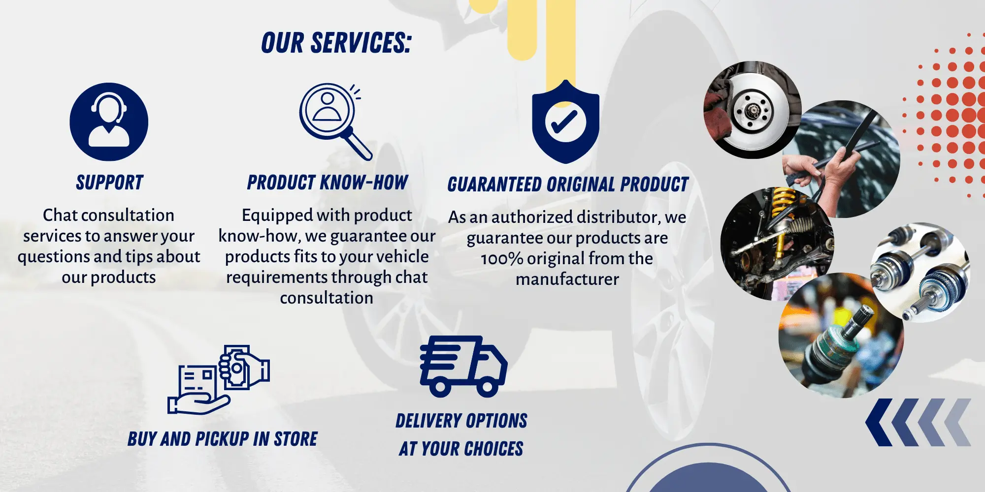 Following the dynamic change in business environment, we implement modern warehousing and operational system with the purpose of providing greater services to our customers in more efficiently. We also equip ourselves with experienced dedicated team, specialized in handling automotive spare parts. In addition to quality products and greater customer services, maintaining a reliable/trustworthy business is among our highest priority.