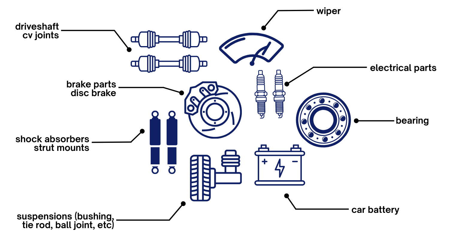 - Suspensions (bushing, tie rod, ball joint, etc) drive shaft, cv joints
